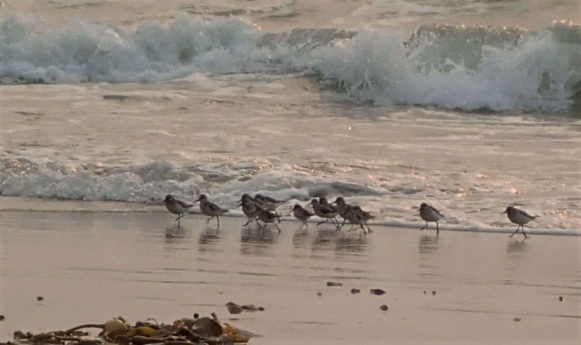 Another time, on one of our walks, we saw sandlings feeding on the wet shore and playfully riding the sun-kissed waves as they washed up on shore.